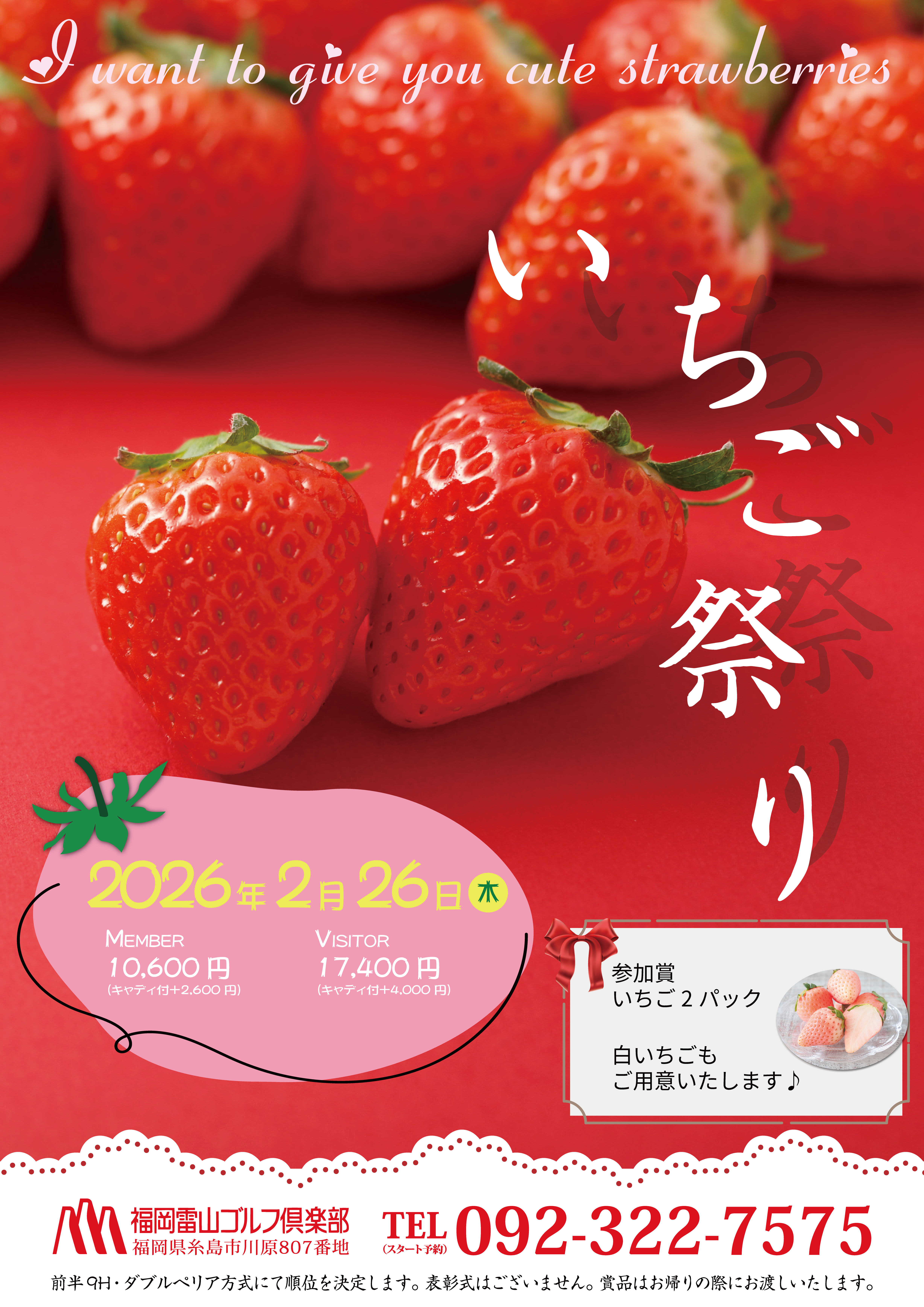 いちごコンペ メンバー様 キャディ付 13,200円 セルフ 10,600円 ビジター様 キャディ付 21,400円 セルフ 17,400円 ※プレーフィ・税込み・参加費・4Bの料金になります。 参加賞:いちご2パック ※前半9Hのスコアをダブルペリア方式にて順位を決定致します。表彰式はございません!賞品はお帰りの際にお渡しいたします。